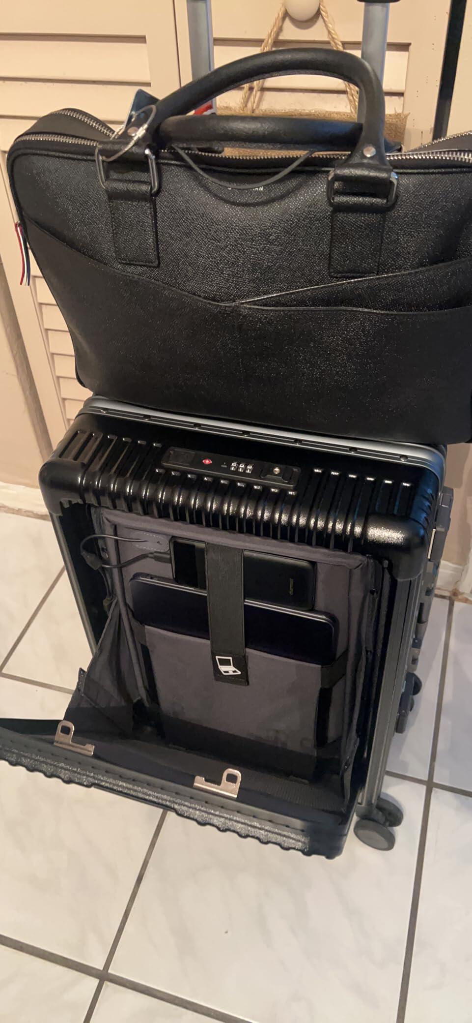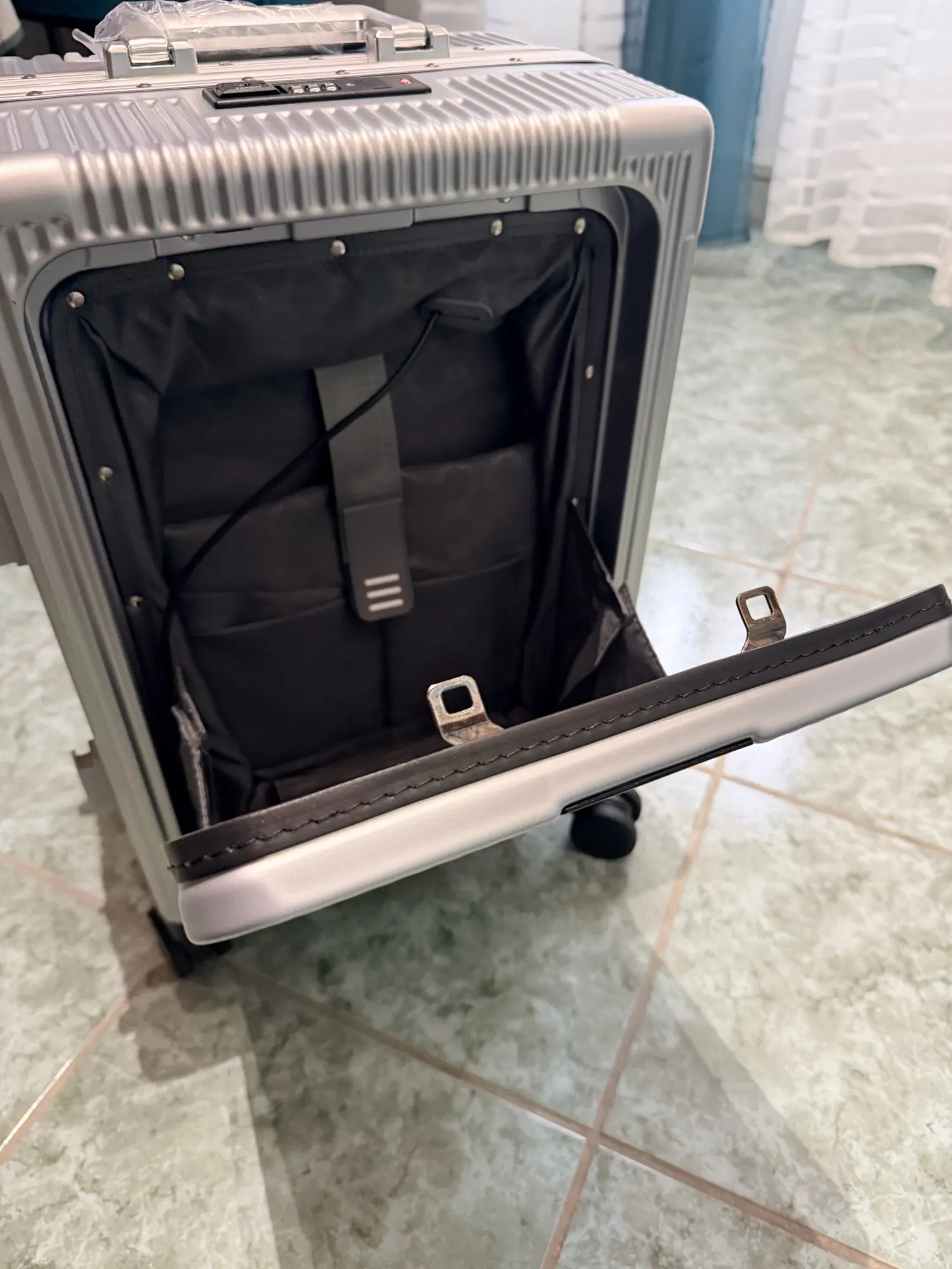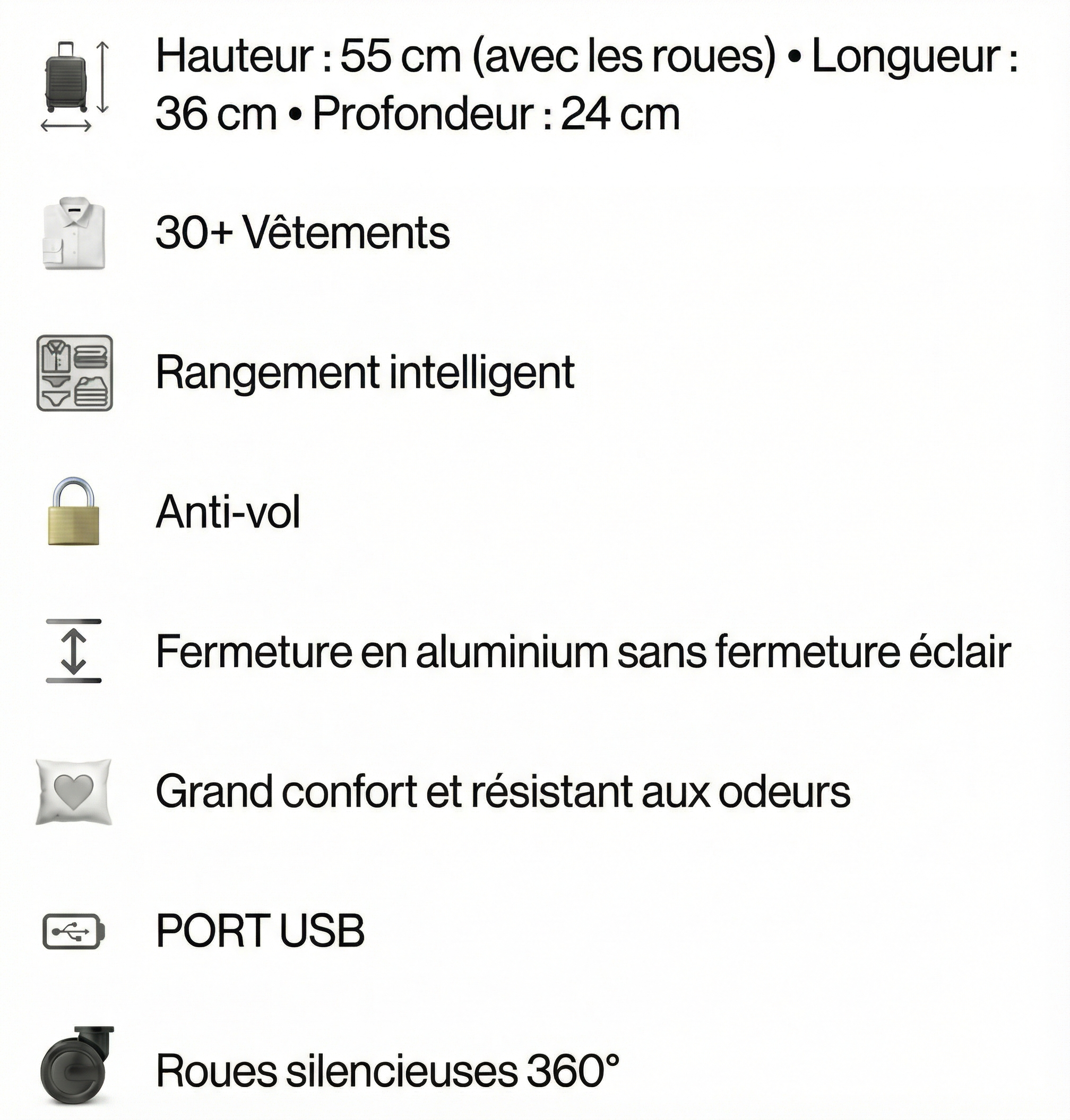 Compact cabin suitcase designed for discerning travelers. Dedicated laptop compartment, integrated USB port for charging your devices on the go. Convenient handbag holder, bottle holder, and phone holder keep essentials within easy reach. Silent 360° wheels ensure smooth mobility through airports and train stations. Cabin-compliant dimensions maximize packing space without compromising maneuverability.